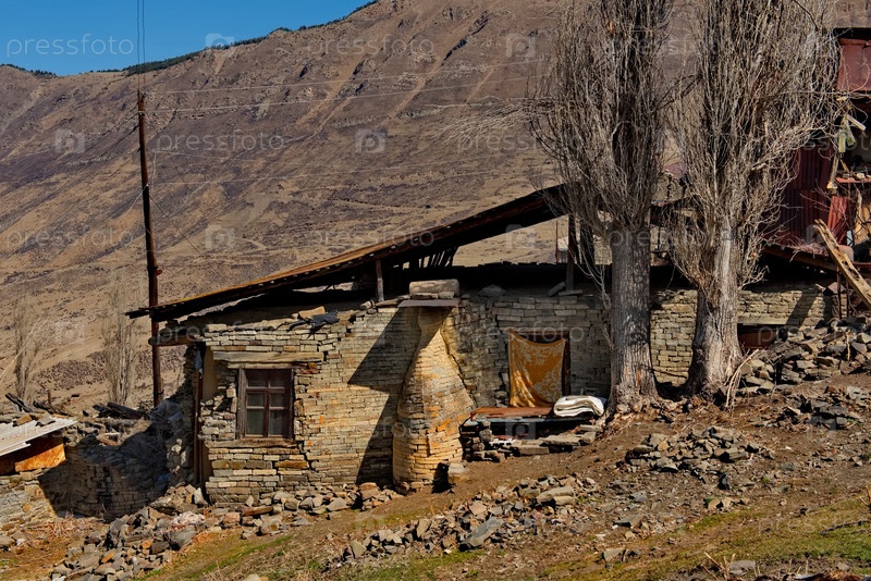 Россия. Северо-Восточный Кавказ, Дагестан. Вид на Кавказские горы через дверной проем заброшенного дома в горной деревне Хуштада. Традиционно все дома построены из камня