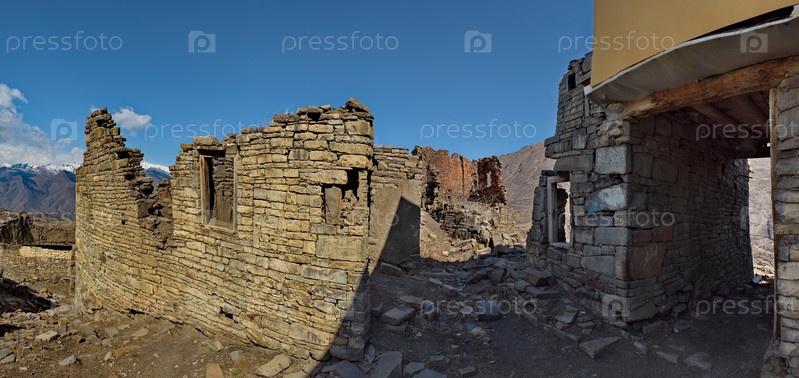 Россия. Северо-Восточный Кавказ, Дагестан. Вид на Кавказские горы через дверной проем заброшенного дома в горной деревне Хуштада. Традиционно все дома построены из камня
