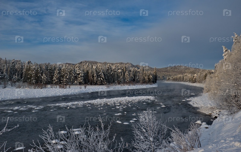 Россия. Юг Западной Сибири, Горный Алтай. Безоблачный морозный рассвет на незамерзшей заснеженной реке Бия близ села Кебезень