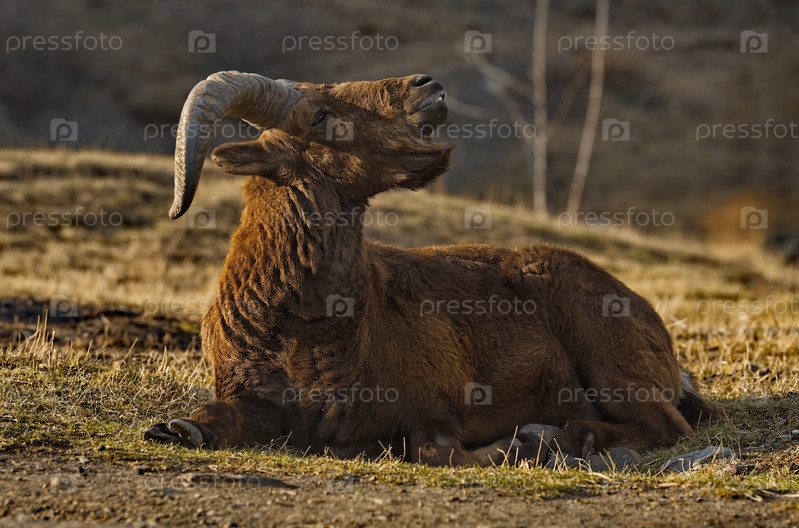 Россия. Северо-Восточный Кавказ. Молодой горный тур с большими изогнутыми рогами на фоне весенних гор Дагестана