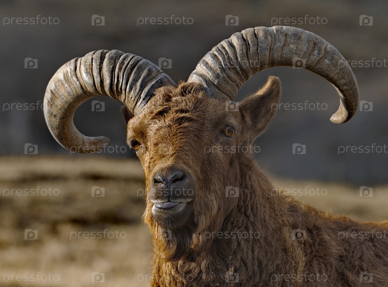 Россия. Северо-Восточный Кавказ. Молодой горный тур с большими изогнутыми рогами на фоне весенних гор Дагестана