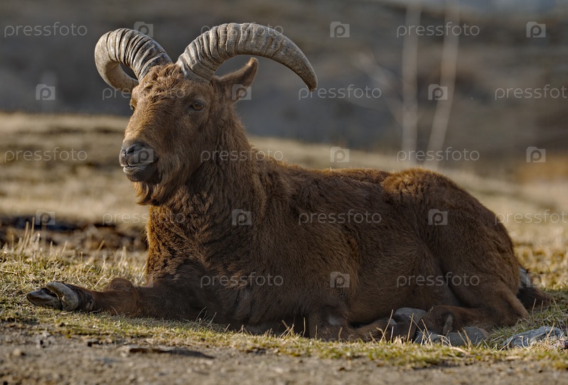 Россия. Северо-Восточный Кавказ. Молодой горный тур с большими изогнутыми рогами на фоне весенних гор Дагестана