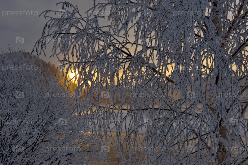 Россия. Юг Западной Сибири, Горный Алтай. Безоблачный морозный рассвет на незамерзшей заснеженной реке Бия близ села Кебезень