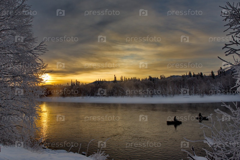 Россия. Юг Западной Сибири, Горный Алтай. Безоблачный морозный рассвет на незамерзшей заснеженной реке Бия близ села Кебезень