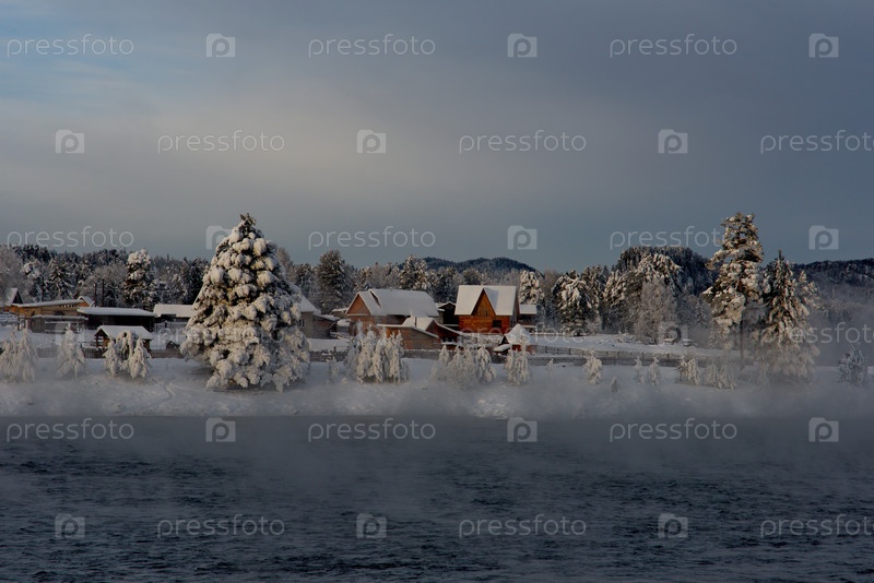 Россия. Юг Западной Сибири, Горный Алтай. Безоблачный морозный рассвет на незамерзшей заснеженной реке Бия близ села Кебезень