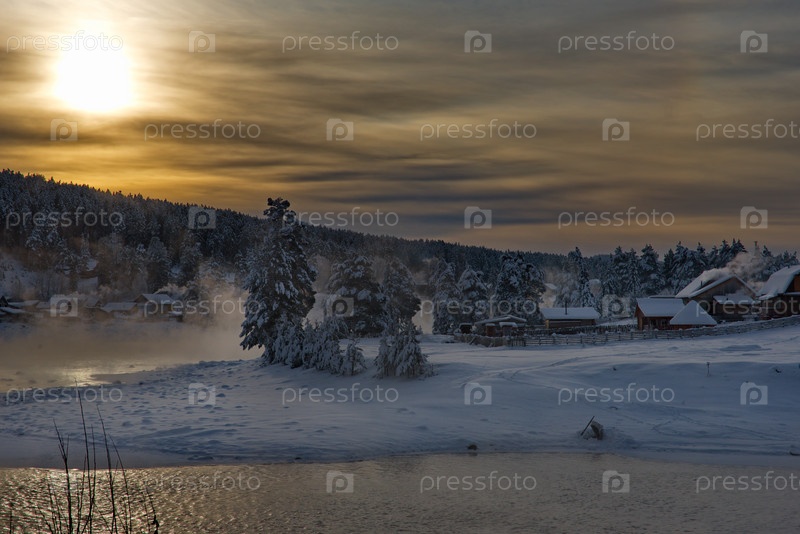 Россия. Юг Западной Сибири, Горный Алтай. Безоблачный морозный рассвет на незамерзшей заснеженной реке Бия близ села Кебезень