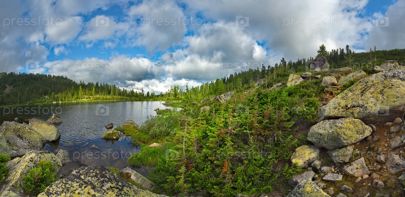 Россия. Юг Сибири. Западный Саян. Панорамный вид на высокогорное озеро, окруженное суровыми скалами, с горного перевала в природном горном парке Ергаки