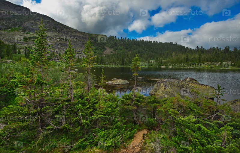Россия. Юг Сибири. Западный Саян. Панорамный вид на высокогорное озеро, окруженное суровыми скалами, с горного перевала в природном горном парке Ергаки