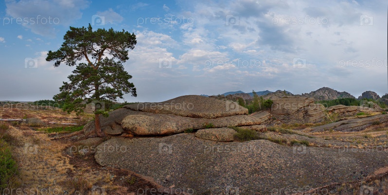 Восточный Казахстан. Живописные одинокие деревья на каменных останцах природного горного парка Баянаул