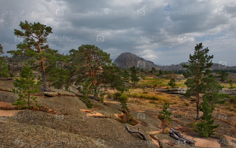 Восточный Казахстан. Живописные одинокие деревья на каменных останцах природного горного парка Баянаул