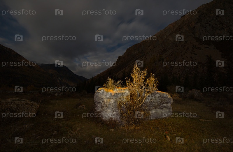 Россия. Юг Западной Сибири. Каменные россыпи в ночной долине реки Чулышман в горах Алтая