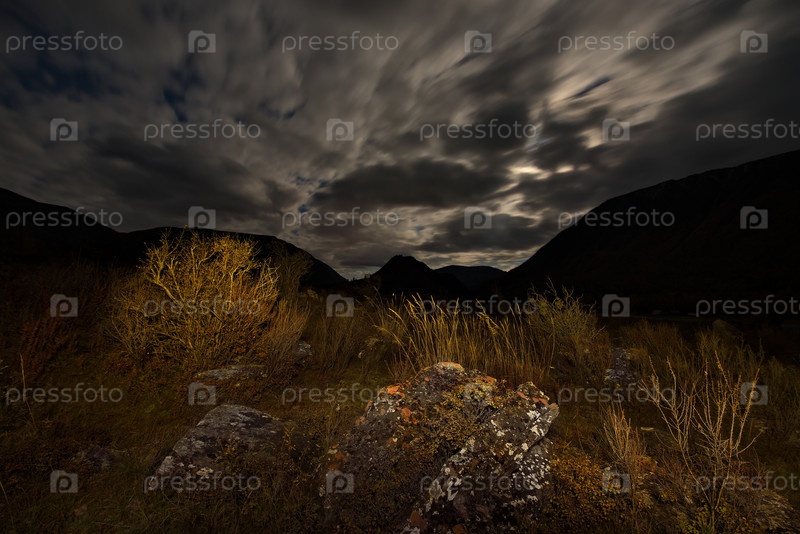 Россия. Юг Западной Сибири. Каменные россыпи в ночной долине реки Чулышман в горах Алтая