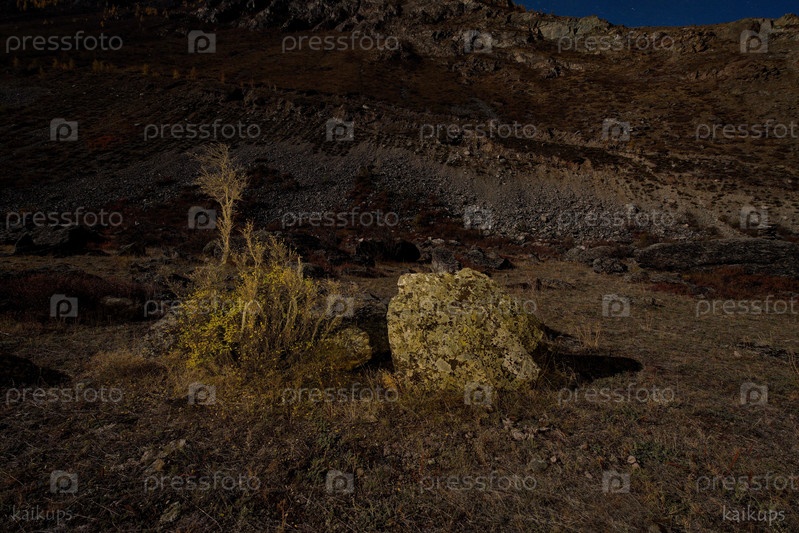 Россия. Юг Западной Сибири. Каменные россыпи в ночной долине реки Чулышман в горах Алтая