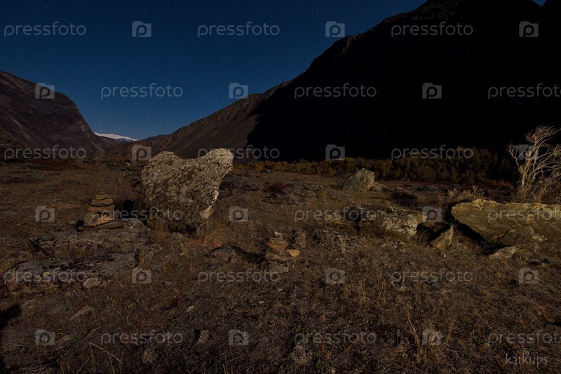 Россия. Юг Западной Сибири. Каменные россыпи в ночной долине реки Чулышман в горах Алтая