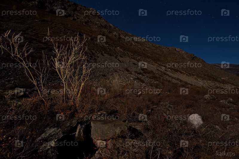Россия. Юг Западной Сибири. Каменные россыпи в ночной долине реки Чулышман в горах Алтая