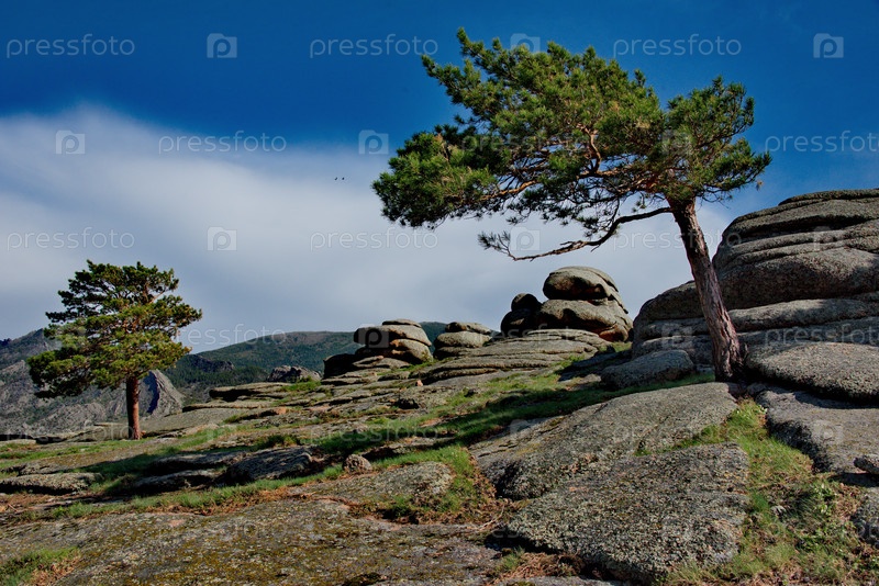 Восточный Казахстан. Живописные одинокие деревья на каменных останцах природного горного парка Баянаул