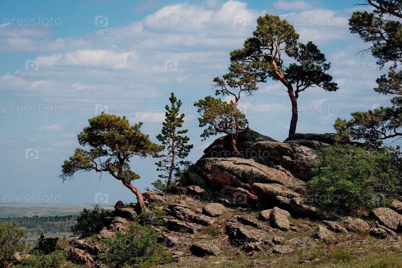 Восточный Казахстан. Живописные одинокие деревья на каменных останцах природного горного парка Баянаул