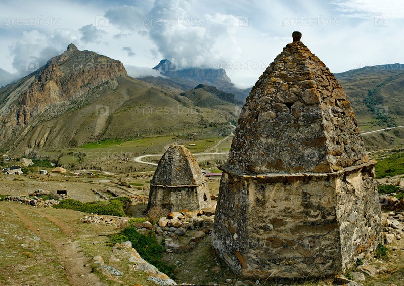 Россия. Северный Кавказ, Кабардино-Балкария. живописная панорама каменных склеп в Городе Мертвых XI века возле поселка Эльтубю в Чегемском ущелье