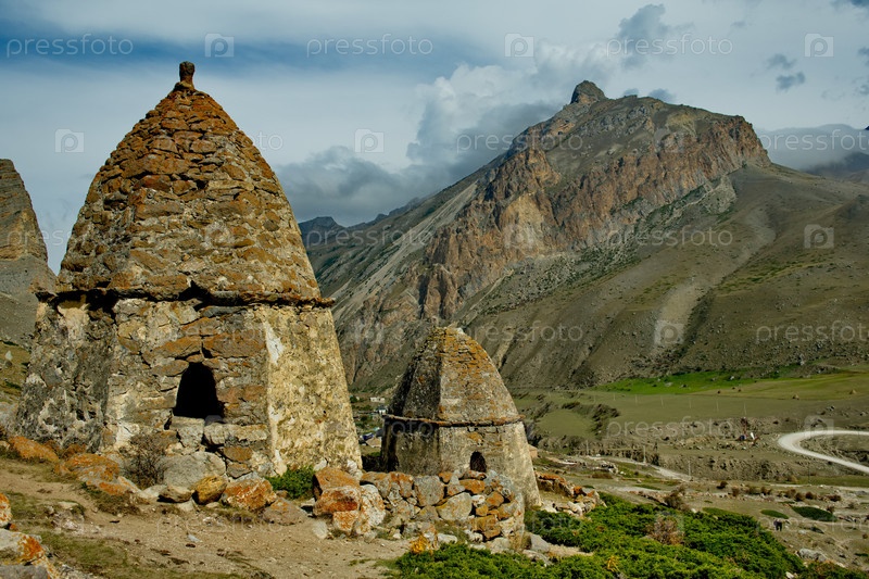 Россия. Северный Кавказ, Кабардино-Балкария. живописная панорама каменных склеп в Городе Мертвых XI века возле поселка Эльтубю в Чегемском ущелье