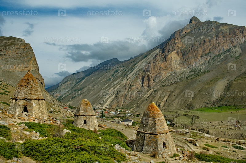 Россия. Северный Кавказ, Кабардино-Балкария. живописная панорама каменных склеп в Городе Мертвых XI века возле поселка Эльтубю в Чегемском ущелье