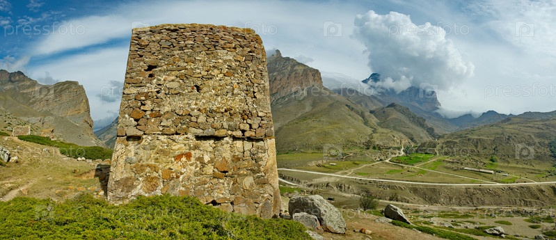 Россия. Северный Кавказ, Кабардино-Балкария. живописная панорама каменных склеп в Городе Мертвых XI века возле поселка Эльтубю в Чегемском ущелье