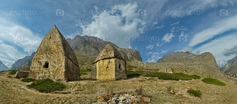 Россия. Северный Кавказ, Кабардино-Балкария. живописная панорама каменных склеп в Городе Мертвых XI века возле поселка Эльтубю в Чегемском ущелье