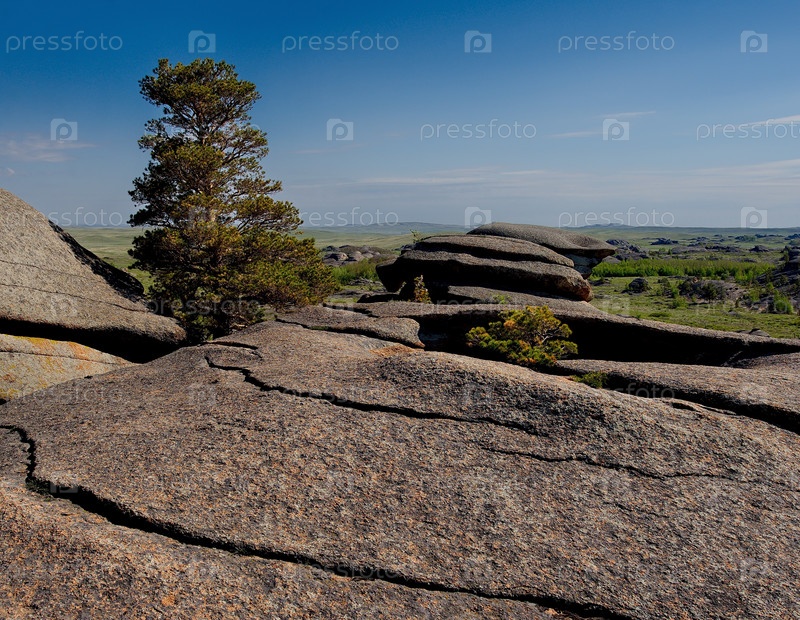 Восточный Казахстан. Живописные одинокие деревья на каменных останцах природного горного парка Баянаул