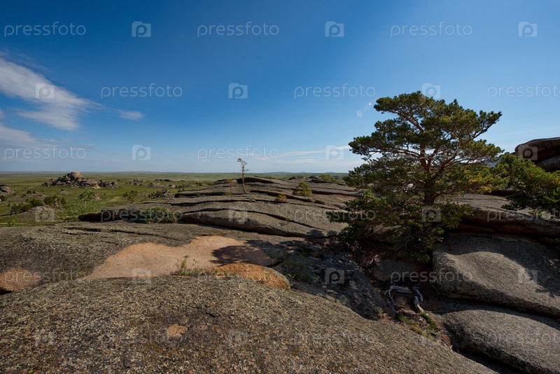Восточный Казахстан. Живописные одинокие деревья на каменных останцах природного горного парка Баянаул