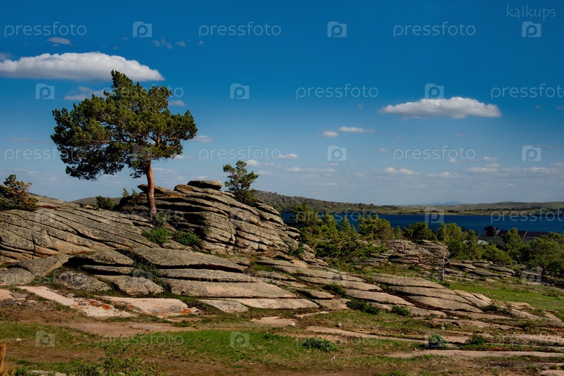Восточный Казахстан. Живописные одинокие деревья на каменных останцах природного горного парка Баянаул