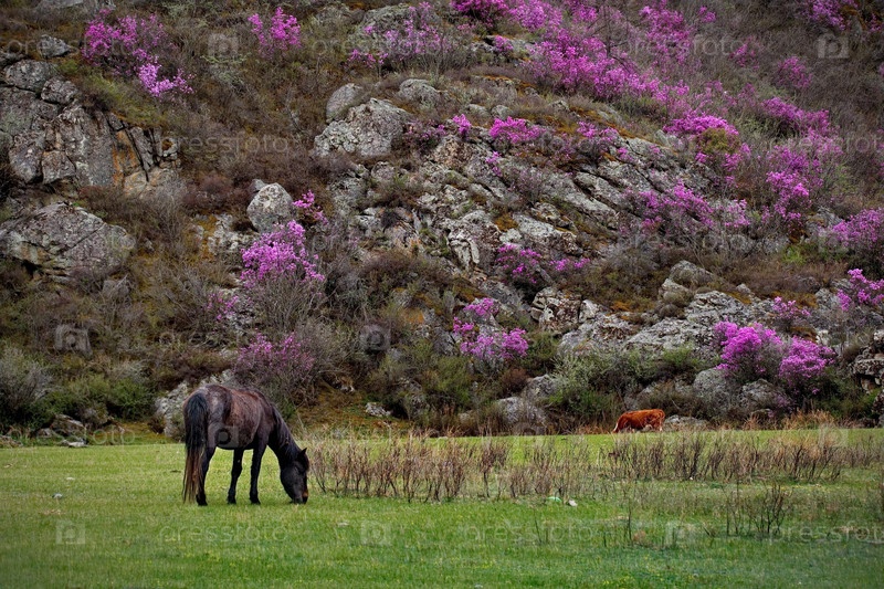 Россия. Юг Западной Сибири. Алтай. Небольшой табун лошадей мирно пасется на крутом горном склоне в окружении огромных камней и цветущего рододендрона