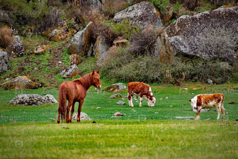 Россия. Юг Западной Сибири. Алтай. Небольшой табун лошадей мирно пасется на крутом горном склоне в окружении огромных камней и цветущего рододендрона