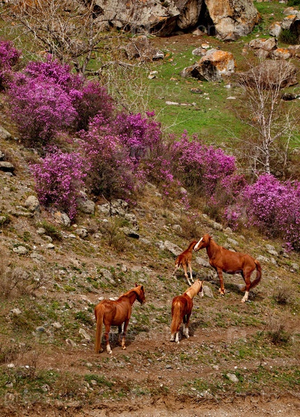 Россия. Юг Западной Сибири. Алтай. Небольшой табун лошадей мирно пасется на крутом горном склоне в окружении огромных камней и цветущего рододендрона