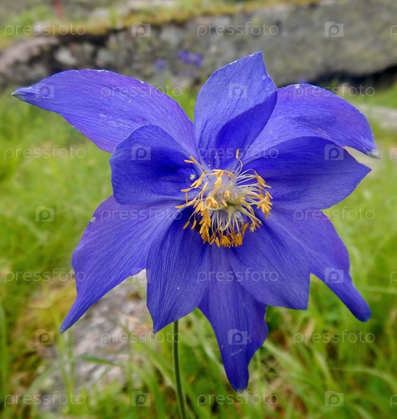Россия. Восточный Саян. Высокогорные цветы аквилегии, распускающиеся на побережье маунтин-райдеров на скалистых участках природного горного парка Ергаки