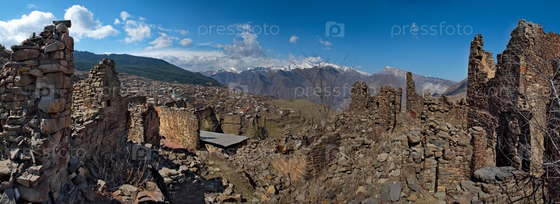 Россия. Северо-Восточный Кавказ, Дагестан. Вид на Кавказские горы через дверной проем заброшенного дома в горной деревне Хуштада. Традиционно все дома построены из камня
