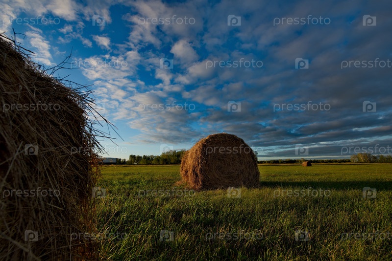 Россия. Западная Сибирь. Летний солнечный вечер на скошенных полях близ города Омска