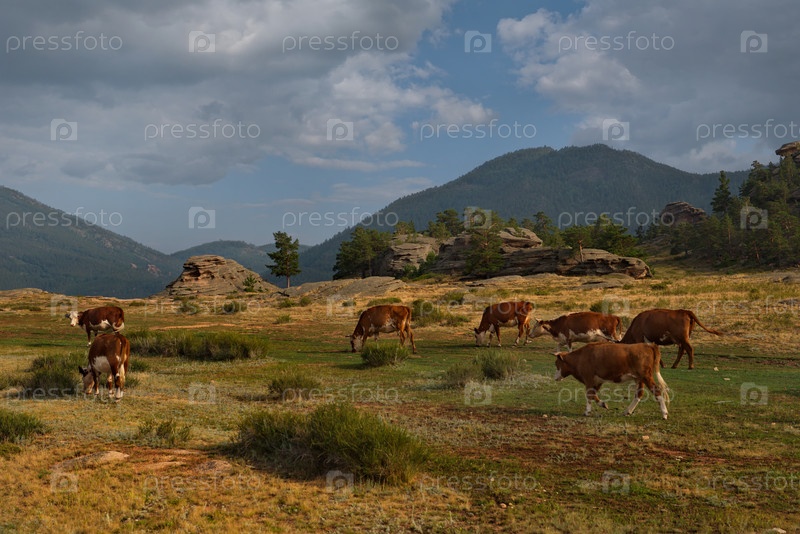 Восточный Казахстан. Мирно пасущиеся коровы в национальном природном горном парке Баянаул