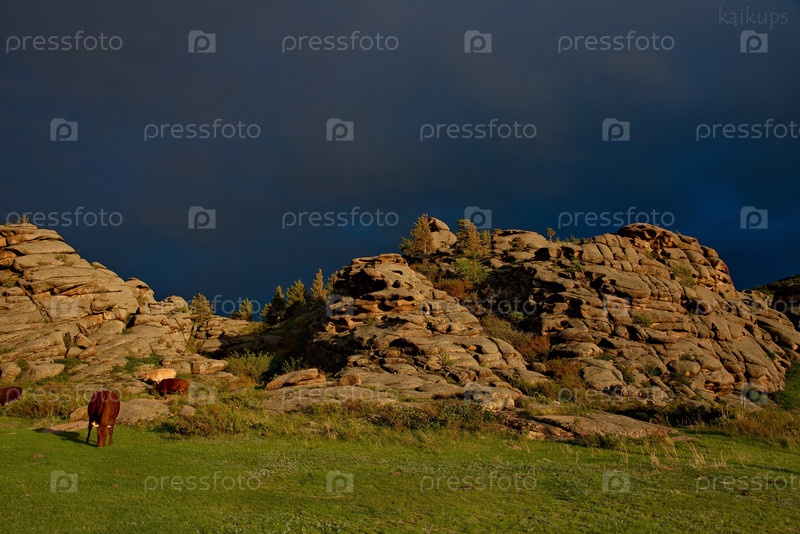 Восточный Казахстан. Мирно пасущиеся коровы в национальном природном горном парке Баянаул