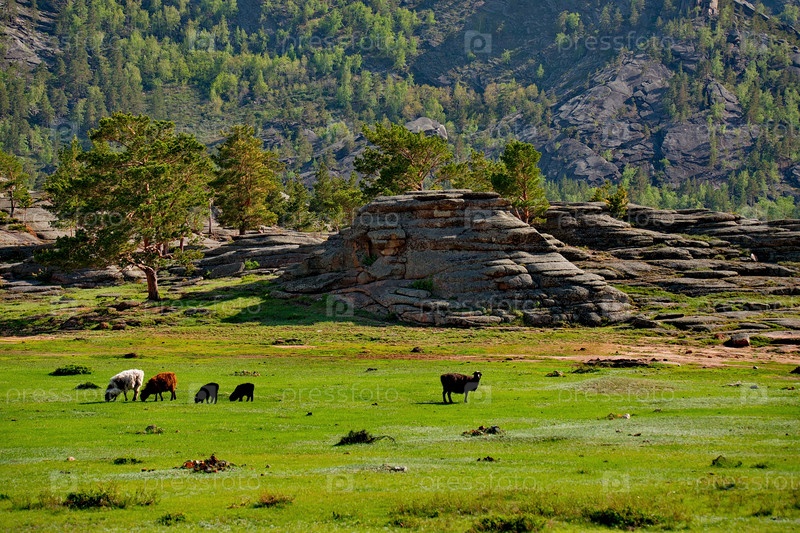 Восточный Казахстан. Мирно пасущиеся коровы в национальном природном горном парке Баянаул