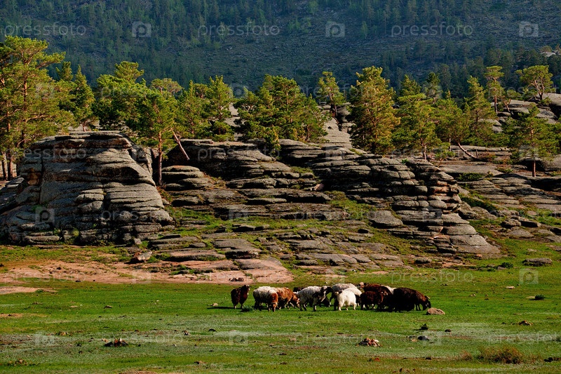 Восточный Казахстан. Мирно пасущиеся коровы в национальном природном горном парке Баянаул