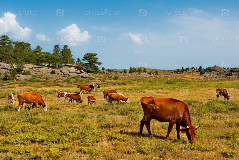 Восточный Казахстан. Мирно пасущиеся коровы в национальном природном горном парке Баянаул