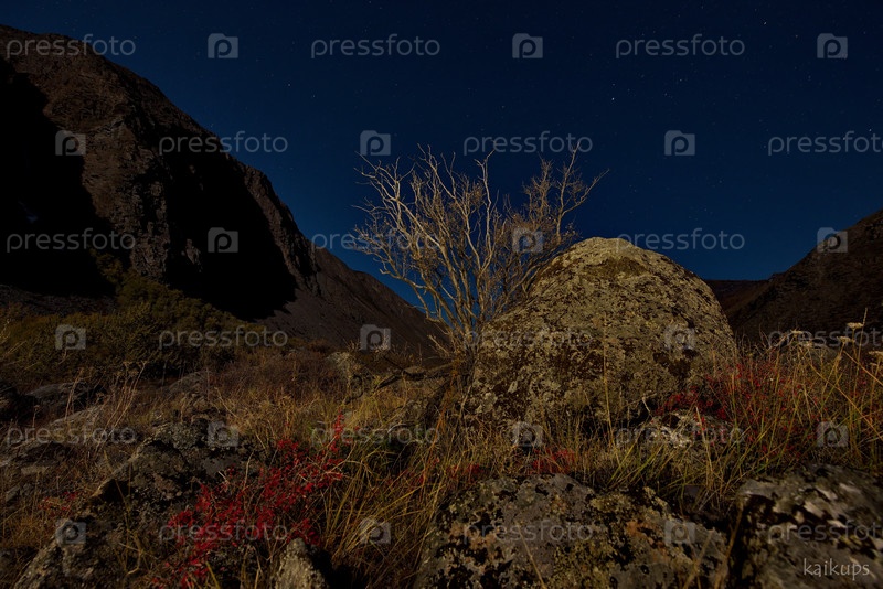 Россия. Юг Западной Сибири. Каменные россыпи в ночной долине реки Чулышман в горах Алтая