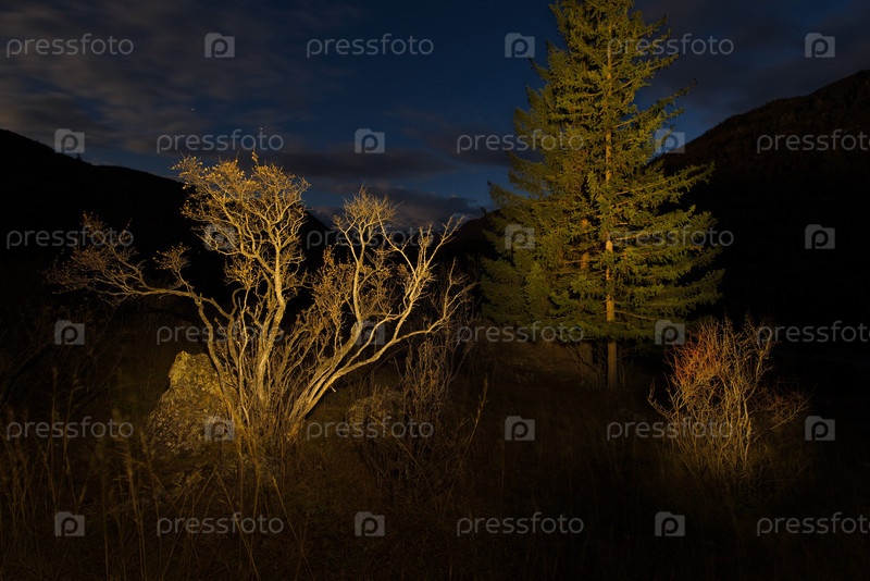 Россия. Юг Западной Сибири. Каменные россыпи в ночной долине реки Чулышман в горах Алтая
