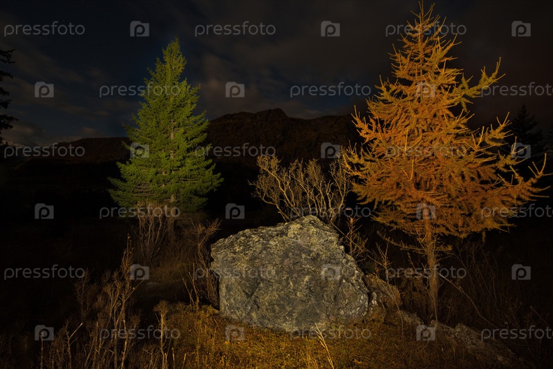 Россия. Юг Западной Сибири. Каменные россыпи в ночной долине реки Чулышман в горах Алтая