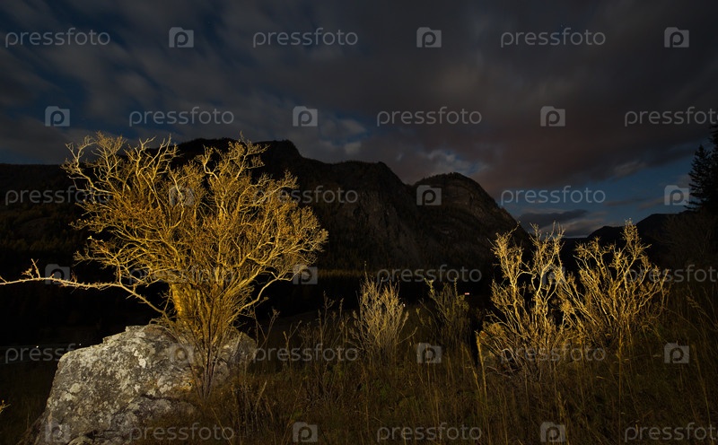 Россия. Юг Западной Сибири. Каменные россыпи в ночной долине реки Чулышман в горах Алтая