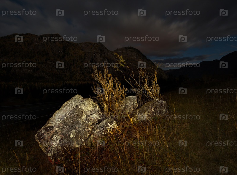 Россия. Юг Западной Сибири. Каменные россыпи в ночной долине реки Чулышман в горах Алтая