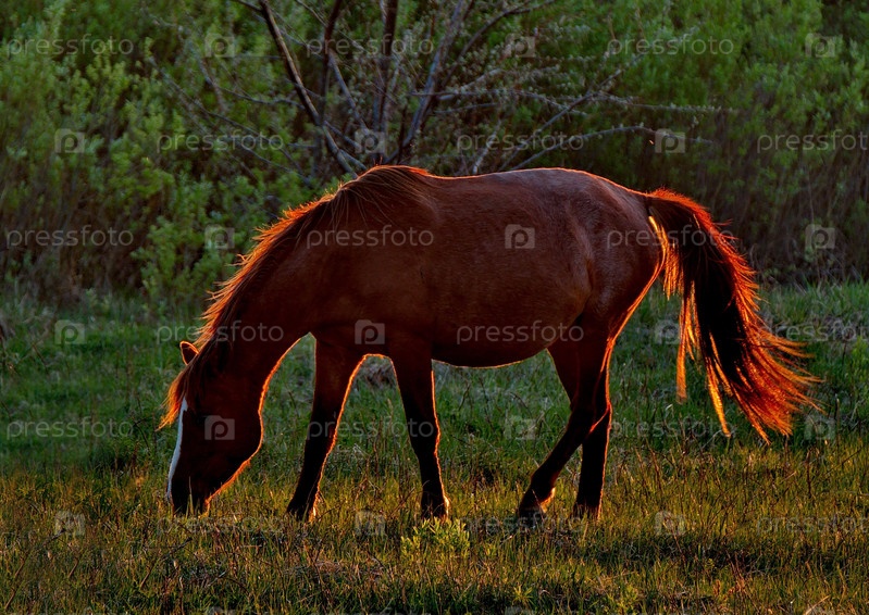 Восточный Казахстан. Лошадь в контровом свете в лучах заходящего солнца