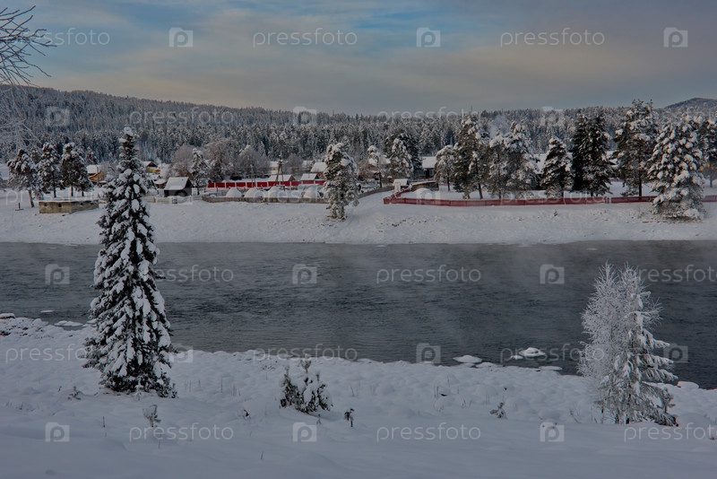 Россия. Юг Западной Сибири, Горный Алтай. Безоблачный морозный рассвет на незамерзшей заснеженной реке Бия близ села Кебезень