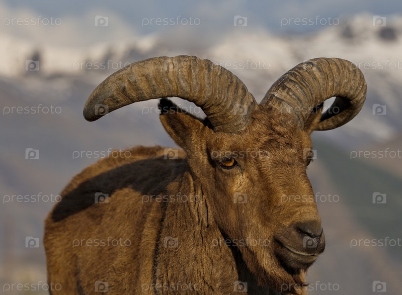 Россия. Северо-Восточный Кавказ. Молодой горный тур с большими изогнутыми рогами на фоне весенних гор Дагестана