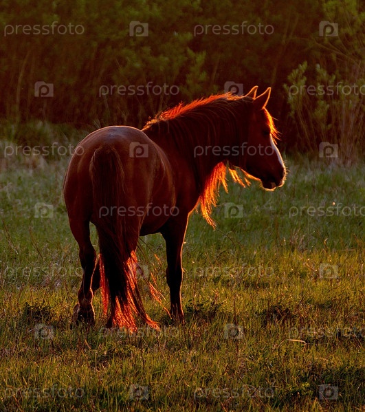 Восточный Казахстан. Лошадь в контровом свете в лучах заходящего солнца