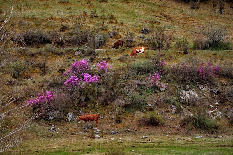 Россия. Юг Западной Сибири. Алтай. Небольшое стадо коров мирно пасется на крутом горном склоне в окружении огромных камней и цветущего рододендрона